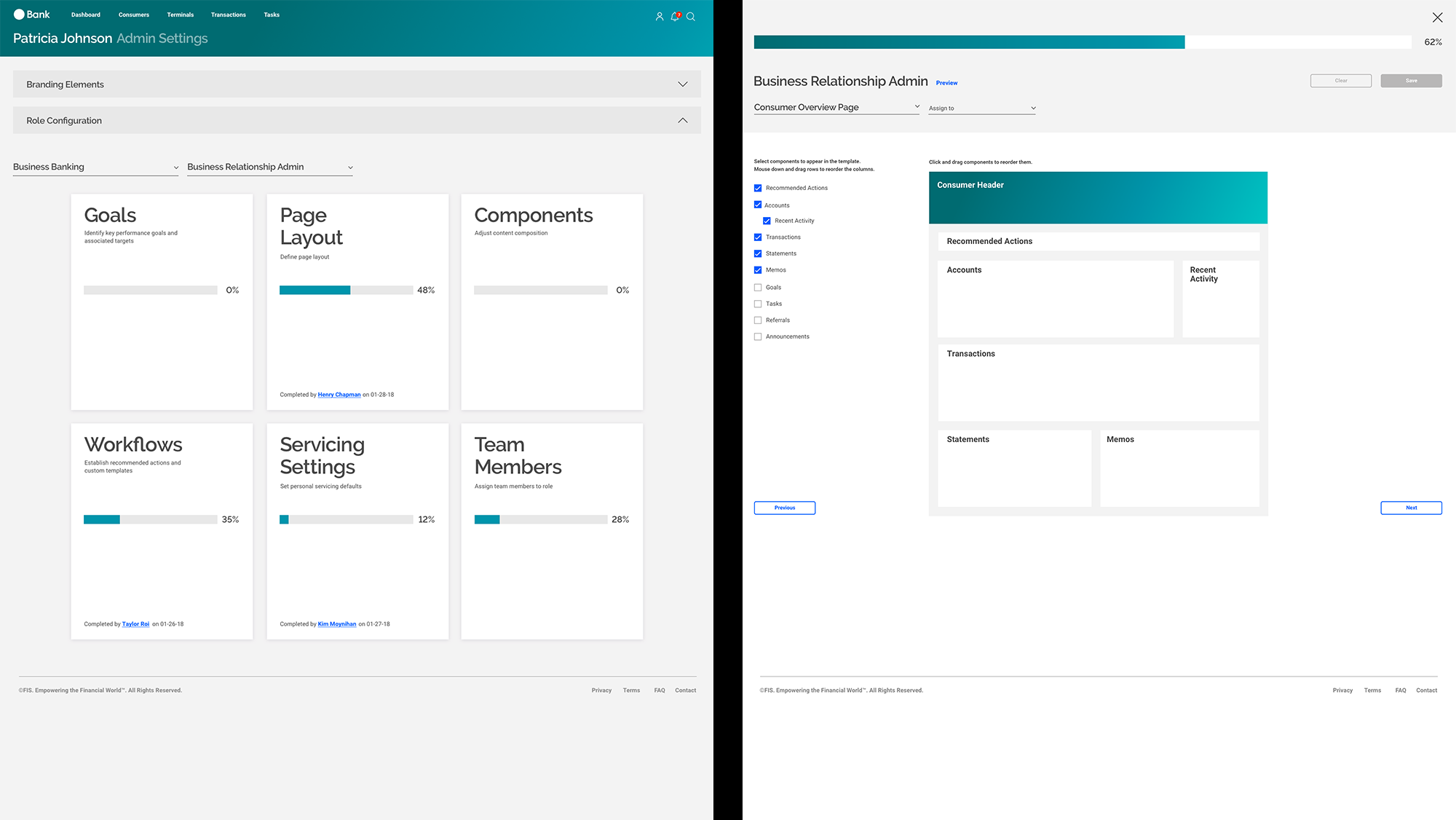 In-depth research and evaluation sessions with bank clients and their customers across the entire FIS product ecosystem informed a series of prioritized capability workflows — addressing key banker pain-points while establishing a foundational design system. These conceptual workflows focused on delivering purposeful customer interactions by shaping an adaptable brand expression for both FIS and its bank clients.